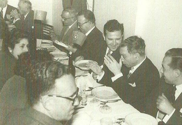 Jantar comemorativo do 16 de Maio de 1828, uma data histórica em Aveiro. Na fotografia, Álvaro Seiça Neves, Mário Sacramento, Júlio Calisto, Dora Seiça Neves, João Sarabando, Costa e Melo. Fotografia da Página “Mário Sacramento e Cecília”.