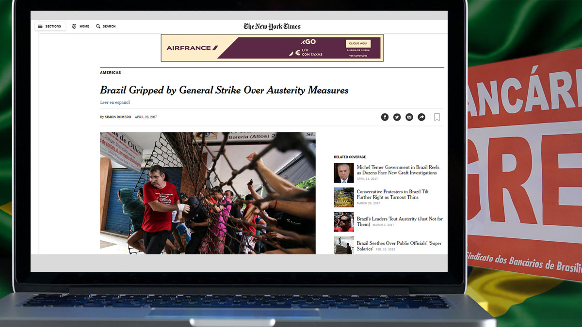 O jornal estadunidense The New York Times, por exemplo, publicou longa reportagem com o título “O Brasil se mobiliza contra a austeridade”. O veículo, que já serviu de bíblia para a mídia nativa, afirma que a greve foi nacional e paralisou transportes, bancos, fábricas e escolas. Já o alemão Deutsche Welle afirma em sua manchete que “Brasileiros se mobilizam pela democracia” e lembra que a última greve geral no Brasil ocorreu em 1996, no governo FHC. O veículo explica que o protesto foi as reformas propostas “pelo governo conservador do presidente Michel Temer”. Já o espanhol El País estampa no título: “Greve geral desafia as reformas do governo brasileiro”. O francês Le Monde destaca: “Greve histórica”. A rede britânica BBC registra: “Primeira greve geral em duas décadas”. Até o conservador Clarín, da Argentina, foi mais honesto do que os jornais nativos.