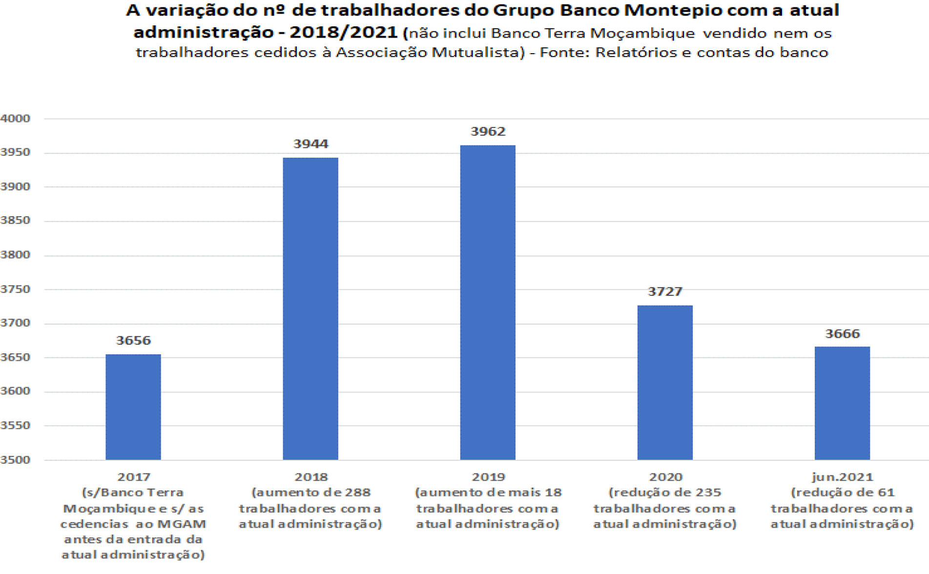 Embora aquando da entrada em funções da atual administração já falasse em excesso de trabalhadores, o certo é que logo no primeiro ano em funções contratou um numero elevado de novos trabalhadores sendo o saldo líquido (entradas menos saídas por reforma e outros motivos) de +288 em 2018, o que determinou que o numero de trabalhadores do grupo Banco Montepio tenha aumentado, entre 2017 e 2018, de 3656 para 3944, a que somaram mais 18 em 2019, ou seja, entre 2017 e 2019, o numero de trabalhadores do grupo Banco Montepio cresceu em 306 trabalhadores. E, repito, isto quando já dizia que havia trabalhadores em excesso.