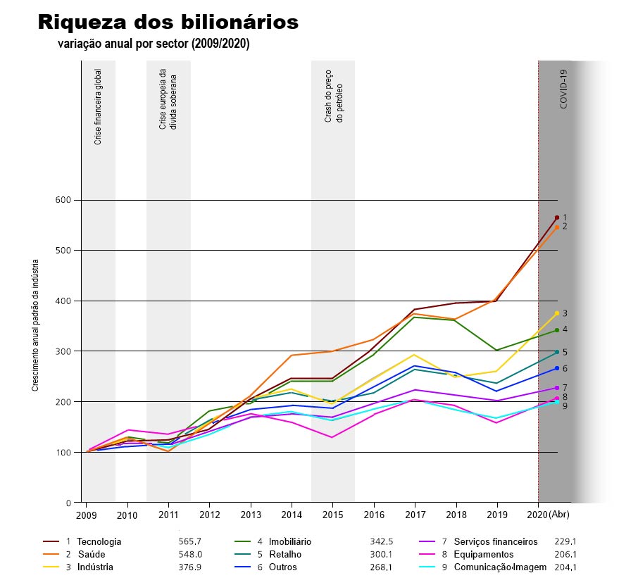 O relatório confirma a já conhecida ideia da concentração das grandes fortunas – que representarão um valor global, estimado em finais de Julho deste ano, de 10,2 biliões de dólares – e se inicialmente a pandemia teve sobre eles algum impacto negativo, é já claro neste momento que a riqueza acumulada daquela ínfima minoria terá recuperado, no segundo trimestre do ano, mais de 25%, com especial destaque para os investidores nos sectores tecnológico e da saúde, que viram os seus activos valorizarem-se mais de 40% e 50%, respectivamente, enquanto os que optaram por sectores como o do entretenimento, do imobiliário e dos serviços financeiros a crescerem pouco mais de 10%.