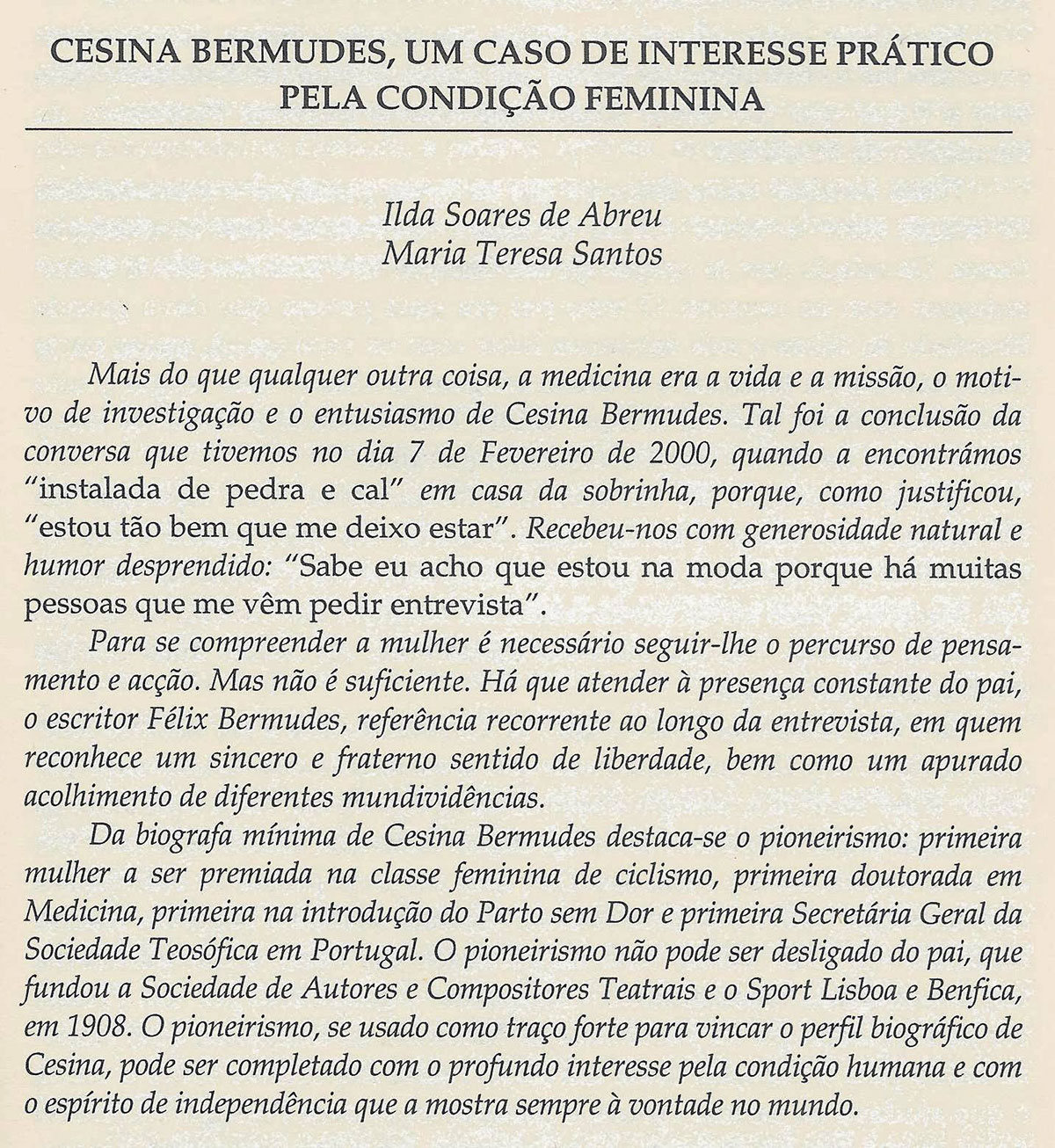 Entrevista realizada a Cesina Bermudes por Ilda Soares de Abreu / Maria Teresa Santos (07 de Fevereiro de 2000)