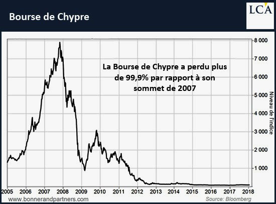 Como explica, em francês, o americano Bill Bonner: Chypre est une perdante. Son marché boursier a perdu 99,986% depuis son sommet en 2007. En d’autres termes, si vous aviez investi 1 000 € dans des valeurs chypriotes il y a neuf ans, vous auriez aujourd’hui 10 centimes. La crise de 2008-2009 a frappé Chypre de plein fouet. Le PIB a chuté de 28%. Le chômage a augmenté à 11%. Aujourd’hui, la moitié des prêts d’entreprise sont en souffrance.”
