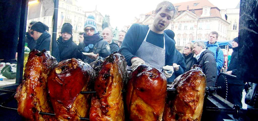 Em Praga, além das sempre presentes salsichas vendidas em rulotes por praças e ruelas locais, uma das especialidades é o presunto assado ao ar livre, servido com pão e mostarda. Também na rua pode encontrar o doce Trdelník, um tubo anelado feito de massa fina e crocante, assada em espetos que ficam rodando sobre o fogo.