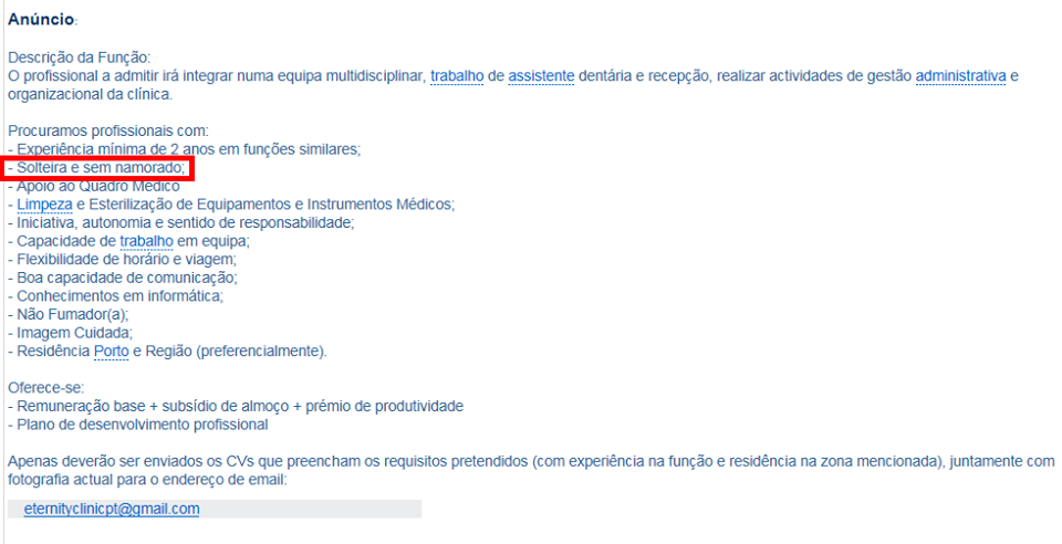 Emprego é coisa que não há muito. Por isso nunca se deve deitar fora uma oportunidade. Alegadamente, porque desapareceu o anúncio e só resta uma imagem do mesmo, uma clínica dentária de Braga, a expandir-se para o Porto, anda à procura de uma assistente de arranca-dentes que seja “solteira e sem namorado” e “imagem cuidada”.