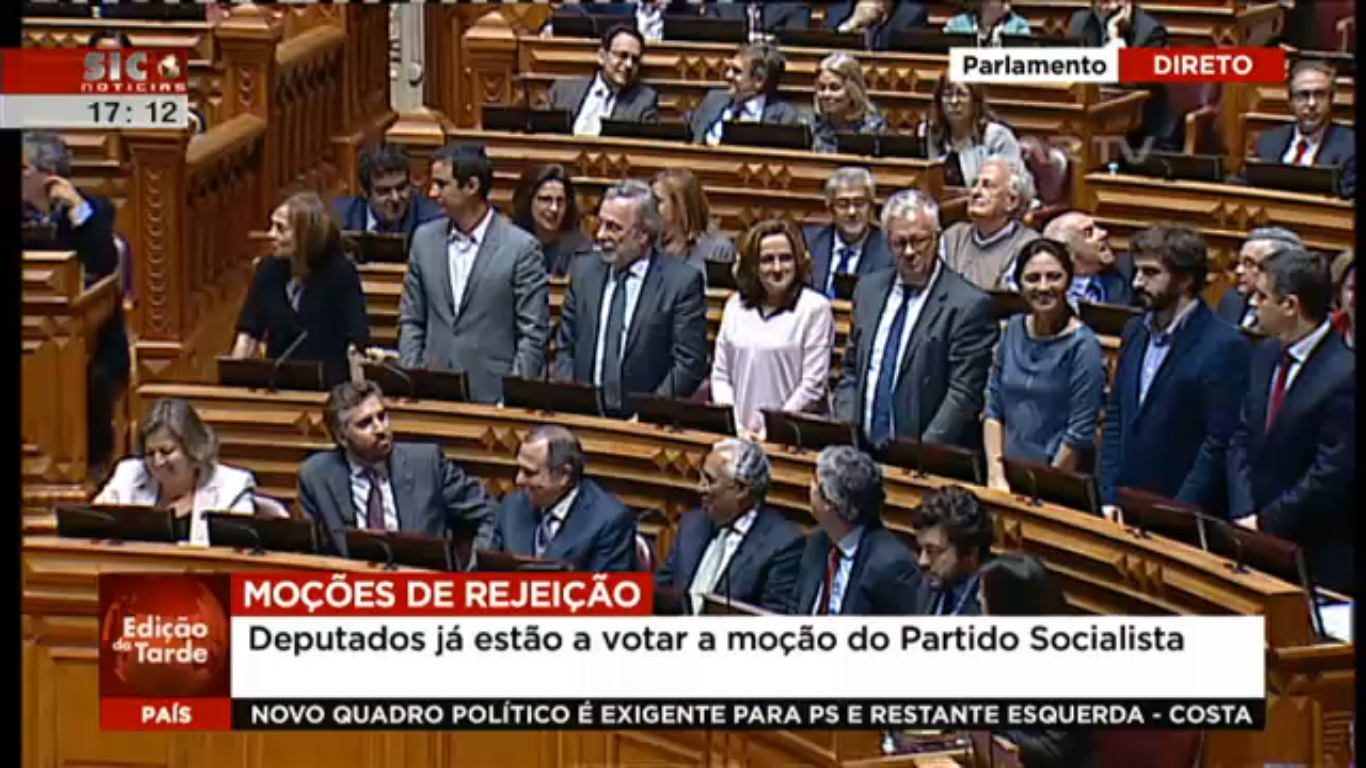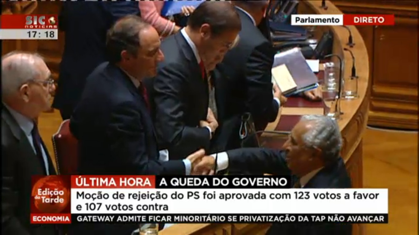 O Governo liderado por Passos Coelho caiu no Parlamento, após a votação da moção de rejeição apresentada pelo PS, que teve o apoio de 123 deputados (PS, BE, PCP, Verdes e PAN) e o voto contra de apenas 107 (PSD e CDS).