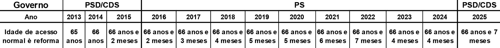 Apesar disso, durante o governo do PSD/CDS/troika foi publicado 167-E/2013. De acordo com art.º 5º deste Decreto-Lei que altera o art.º 20 do Decreto-Lei 187/2007 ”a idade normal de acesso à pensão de velhice em vigor, 65 anos, será acrescida do número de meses necessários à compensação do efeito de redução no cálculo das pensões decorrente da aplicação do novo fator de sustentabilidade correspondente ao ano de 2013, tendo por referência uma taxa mensal de bonificação de 1%”. Como consequência, a idade normal nunca mais parou de aumentar como consta do quadro 1.