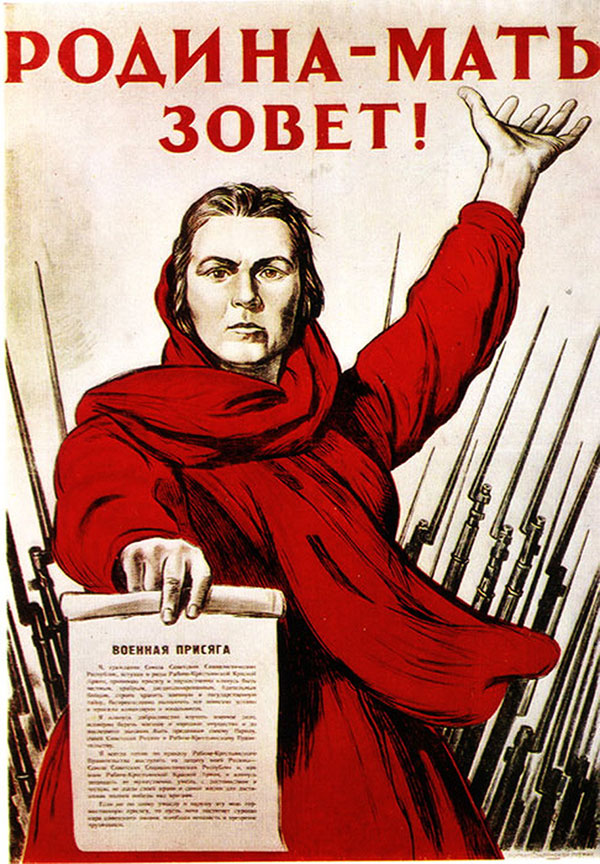 Acima temos a comparação entre um cartaz soviético de 1941 e um cartaz norte-americano de 1950, aproximadamente. No primeiro, chamado “Mãe Pátria”, criado pelo artista Irakli Moissejewitsch, faz referência à proposta de que o serviço militar obrigatório abrangesse as mulheres, que surgiu após o lançamento da Operação Barbarossa de invasão da União Soviética por tropas nazistas em 22 de junho de 1941. Nele, vê-se uma mulher forte, à frente na decisão de combater, serviço teoricamente masculino.