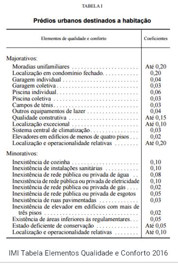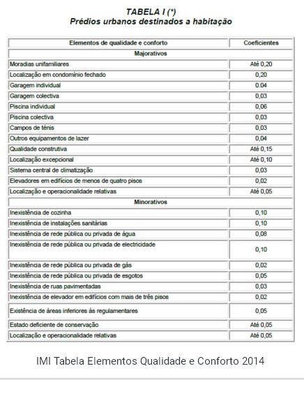 - A alteração no IMI é aplicada ao coeficiente de localização e operacionalidade relativa. Este coeficiente é apenas 1 dos 13 elementos de Qualidade e Conforto (ver tabelas) e 1 dos 6 elementos incluídos na fórmula usada para determinar o valor de um imóvel – e o imposto que proporcionalmente o imóvel deve pagar;