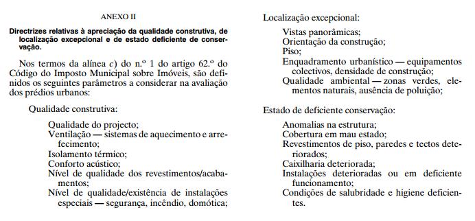 O DL referido acima, 287/2003 de 12 de Novembro, publicado no tempo do Governo Durão Barroso/Paulo Portas foi acrescentado, através da Portaria 982/2004, de 4 de Agosto, com “Directrizes relativas à apreciação da qualidade construtiva, de localização excepcional e de estado deficiente de conservação” as quais constam do Anexo II e que reproduzimos na imagem abaixo.