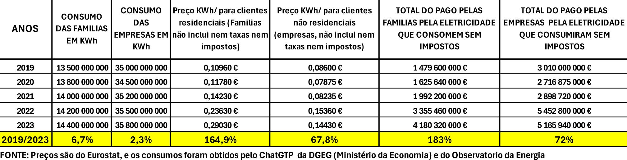 Quadro 2 – Aumentos dos preços de eletricidade e encargos suportados por famílias e empresas em Portugal -2019/23