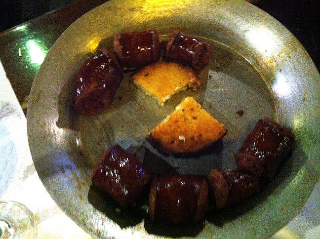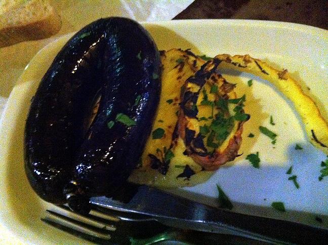Provámos as entradas de linguiça do Pico com inhame frito. O inhame é um pouco sensaborão mas a linguiça era deliciosa. Morcela com ananás, um bom contraste entre a doçura e acidez do ananás e a gordura da morcela de sangue de porco.