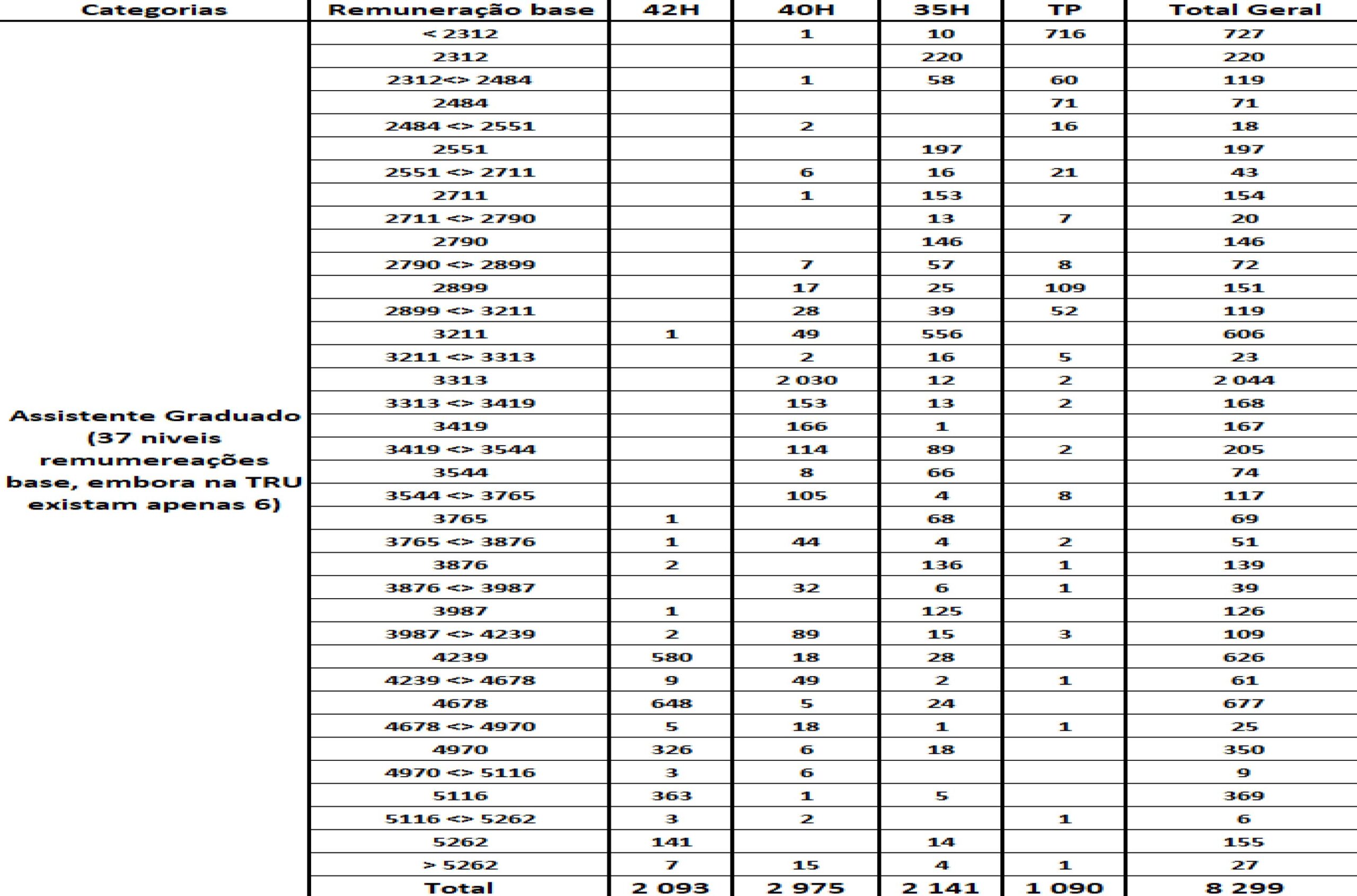 PROLIFERAÇÃO DE NIVEIS SALARIAIS EM NUMERO MUITO SUPERIOR À TRU:APESAR DE CONSTAR NA TABELA REMUNERATÓRIA ÚNICA APENAS 4 NIVEIS REMUNERATORIOS NA CATEGORIA DE ASSISTENTE GRADUADO SENIOR , O MINISTÉRIO DA SAÚDE INFORMOU QUE EXISTEM DE FACTO 27 NIVEIS REMUNERATÓRIOS