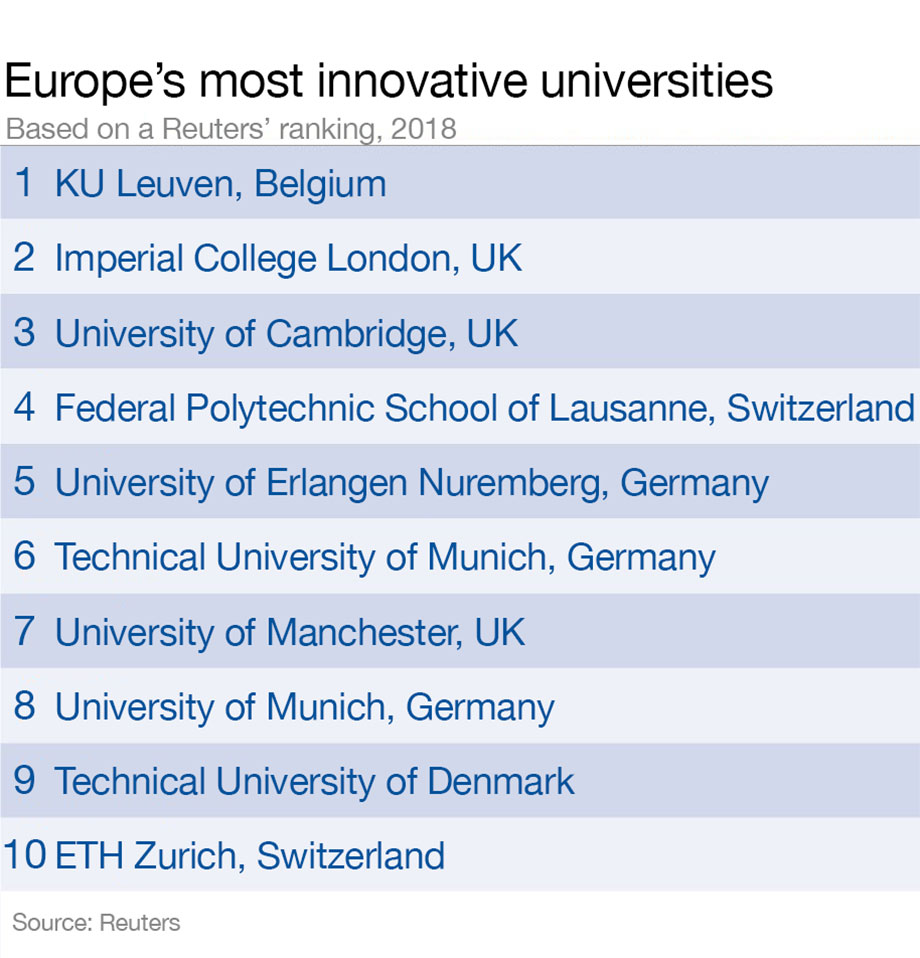 There is inspiration for smaller countries as well: Belgium has seven schools on the list, but with a population of only 11 million people, it can boast more top 100 innovative universities per capita than any other country in Europe. Switzerland, Denmark, Holland and even Ireland are other standouts.